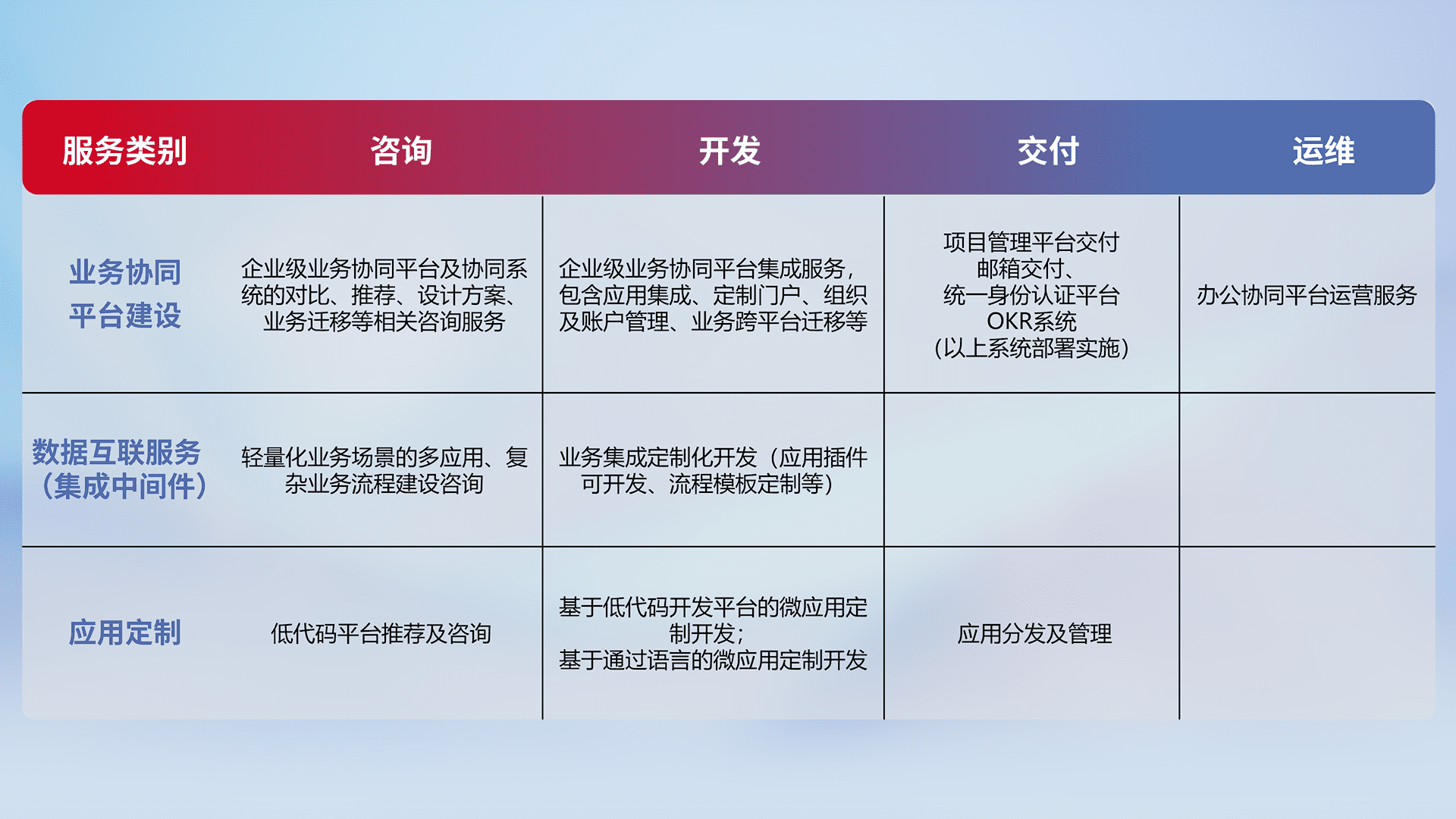 针对钉钉、、企微、、、IDaas等平台级产品提供产品的规划、、方案、、、交付、、、、定制化开发等服务,,实现如统一协同办公、、、智能客户服务、、、、混合会议管理、、智能数据查询、、、、等业务场景,,,,实现数字化转型。。。。